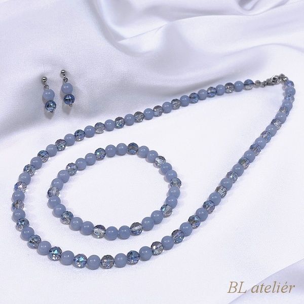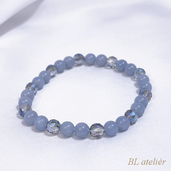 Jemný náramek v světlemodrých barvách. Matný hladký ANGELIT krásně ladí s fasetovaným KŘIŠŤÁLEM modrá aqua aura.