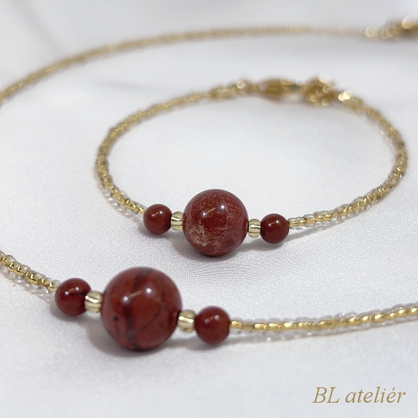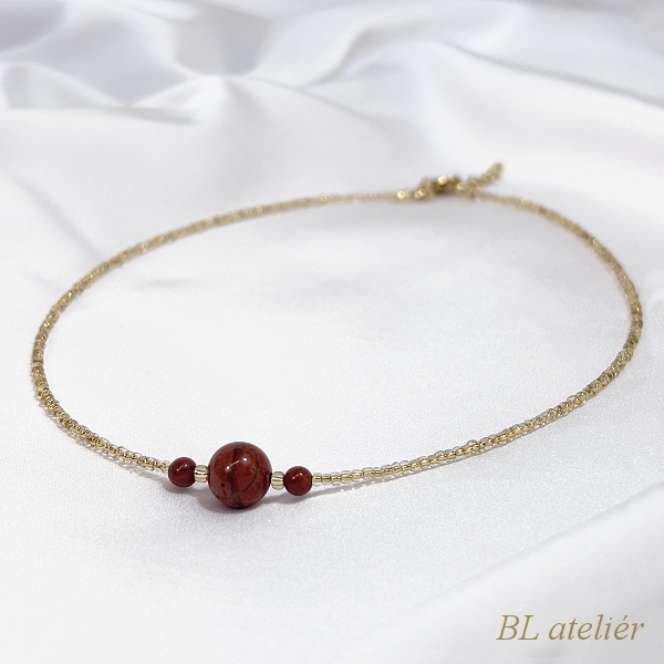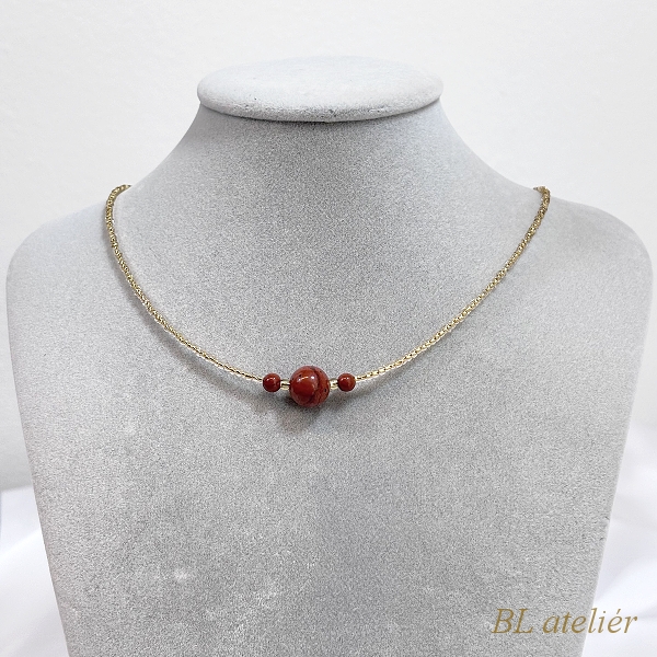 Výrazný doplněk - náhrdelník z červeného JASPISU doplněný skleněným rokajlem zlaté barvy.
