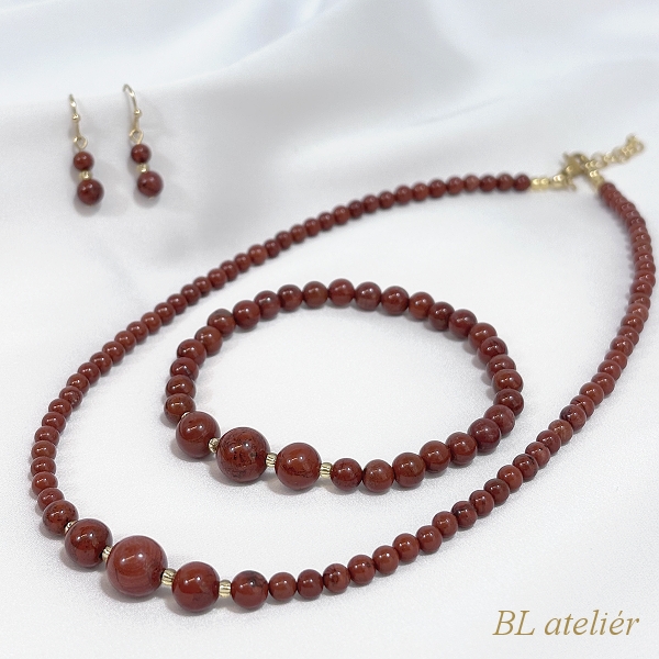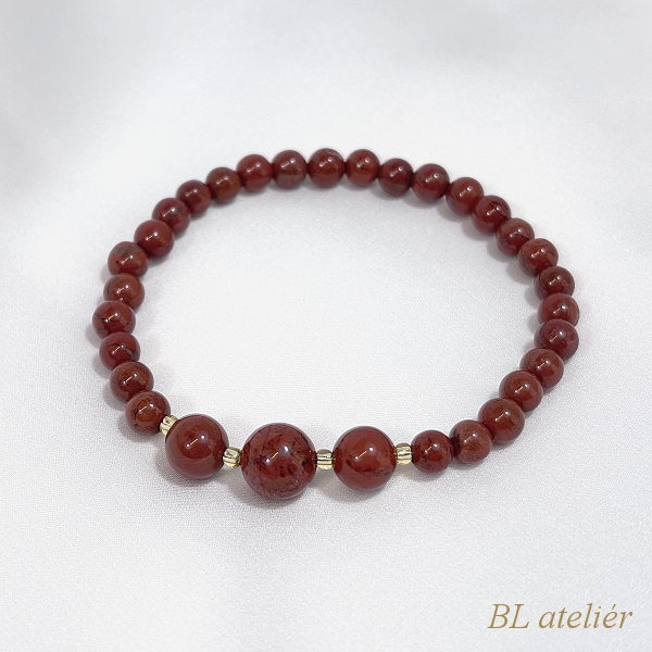 Výrazný doplněk - náramek z červeného JASPISU doplněný skleněným rokajlem zlaté barvy.